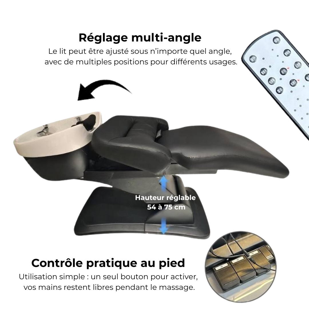 Commandes au pied ou via télécommande intuitive, pour un réglage rapide et une expérience de soin sans interruption.